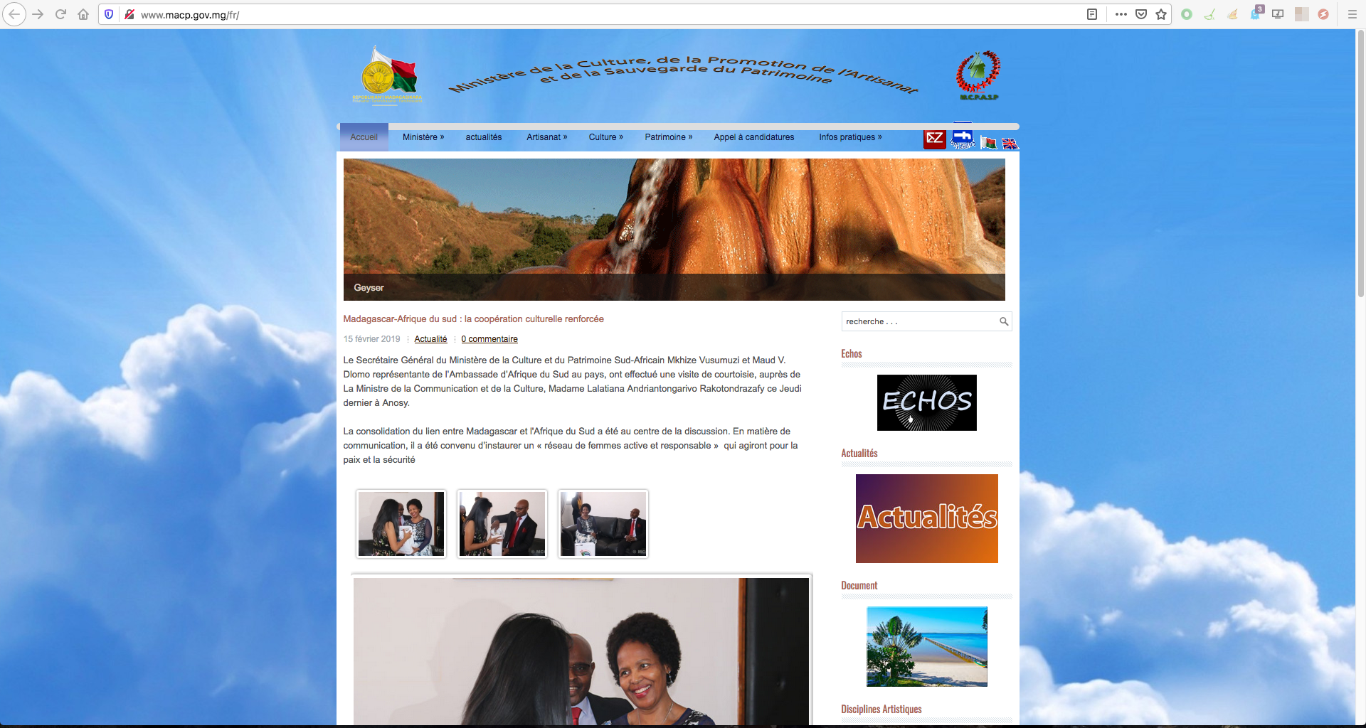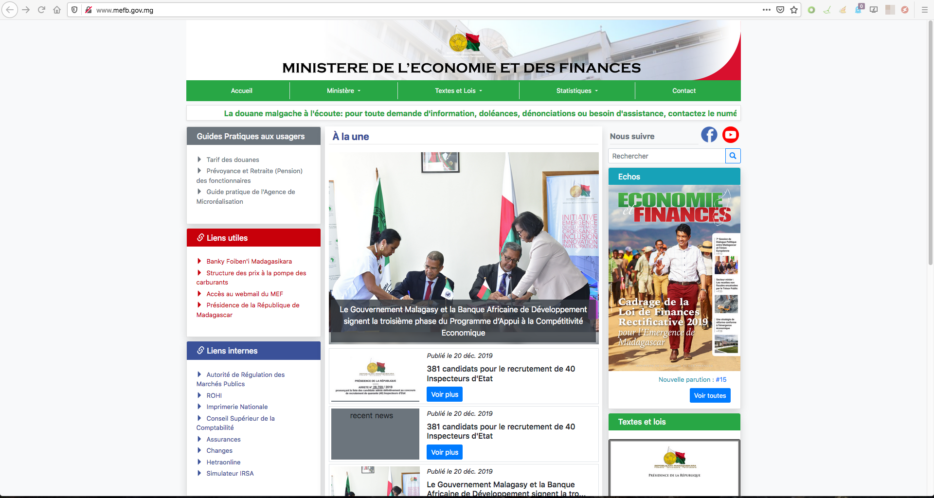 Nos coups de coeur sont pour le site du Trésor Public Malagasy et du Ministère de l'aménagement du territoire, de l'habitat et des travaux publics (MAHTP). Pour le premier, en raison de la qualité des informations disponibles en ligne, enfin pour ceux à qui ça intéresse. Le site donne aussi régulièrement des informations "extra" Trésor Public. Par contre nous nous demandons pourquoi le nom de domaine choisi par le Tésor Public Malagasy n'est-il pas www.tresorpublic.gov.mg ? D'ailleurs d'autres Ministères n'utilisent pas non plus le NS GOV.MG (???). Pour le MAHTP, nous apprécions la base de données qui recensent les Grands Projets à Madagascar, avec un module de recherche intégré par Région, District et Commune.